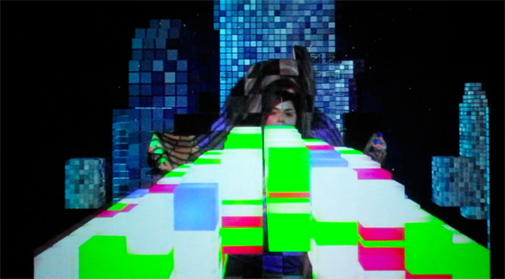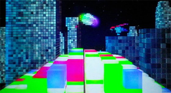 Okay—I’m really not supposed to show you any of Kid Infinity’s cubistic 3D fantasy animation. Like this glimpse (which I shot with a polarized lens on a 2D camera set-up) of a pixelated LAPD helicopter chasing a UFO through a strobing, videogame-like L.A. cityscape. SO FUCKING COOL!