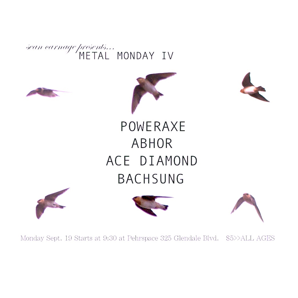 Tonight the evilest—and best—new bands in the world: Bachsung (sadistic drone encounters), Ace Diamond Experience (star of Heavy Metal Funeral), Abhor (an untamed predator with multiple rows of teeth), and Poweraxe (stars of Heavy Metal U-Haul—forged from the finest steel).