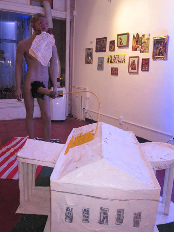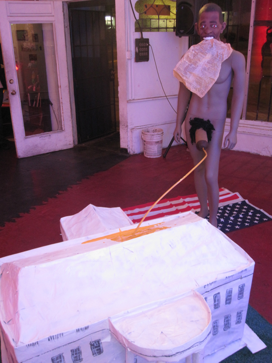 Musician and artist Geoff Geis (and collaborators Sarah Cisco, Caitlin Craggs, and Kitty Dexter) really took Obamaporn to the next level with “Hail to the Chief” and other patriotic tunes on the radio, (black) penis-shaped snacks, and a free-standing fountain depicting man of the night Barack O. as a very well hung Commander-in-Chief standing on the American flag, chewing our Constitution, and pissing all over the White House.