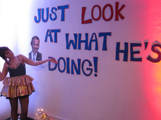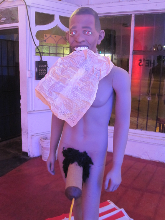 It was like a Tea Party nightmare come to life at Echo Curio last night. Every last paranoid fear about our President was fully visualized in the new art installation, Just look at what he’s doing!. It was an artistic orgy of sexual, racial and political no-no’s that left visitors gasping. With laughter.