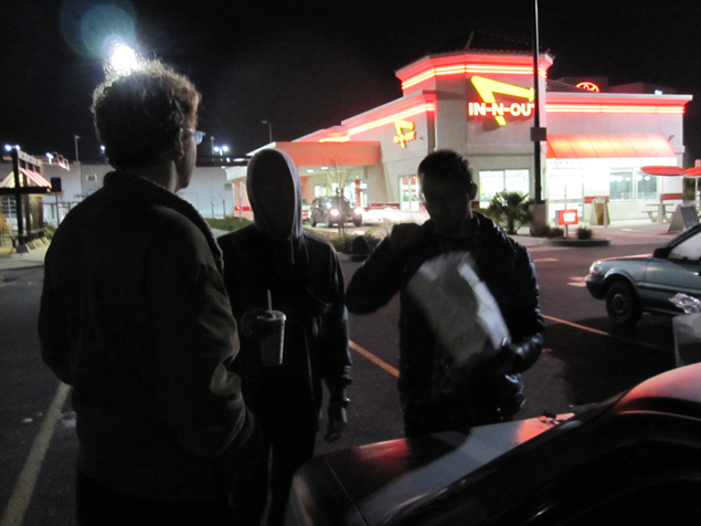 Made a trip to the Berkeley Bowl; Vegan breakfast burritos and nice vibes. We hung out for a while in Oakland. Jon assembled some of his merchandise and Chris got his heart broken a little before we piled in the car with three of the kids from No Babies and drove into San Francisco. This made the weight in the car so heavy that every bump and pot hole made the back of the vehicle smack the ground. When we arrived at the gallery we were shown around. There was a large room with wooden floors and a high arched ceiling that had kind of a cabin feel to it. Below that was a long basement that was lined with curtains and lit with red lights. It looked like a scene out of Twin Peaks. Hiss and Hum started off the show with some psychedelic guitar drone. We performed in the middle and Marissa Magic closed the night by singing over distorted backing tracks with reverbed out vocals. It was both catchy and strange and once again brought the feeling of Twin Peaks to mind (she didn’t turn into a giant though). After the show we headed back to Oakland and got down in the In N’ Out parking lot.