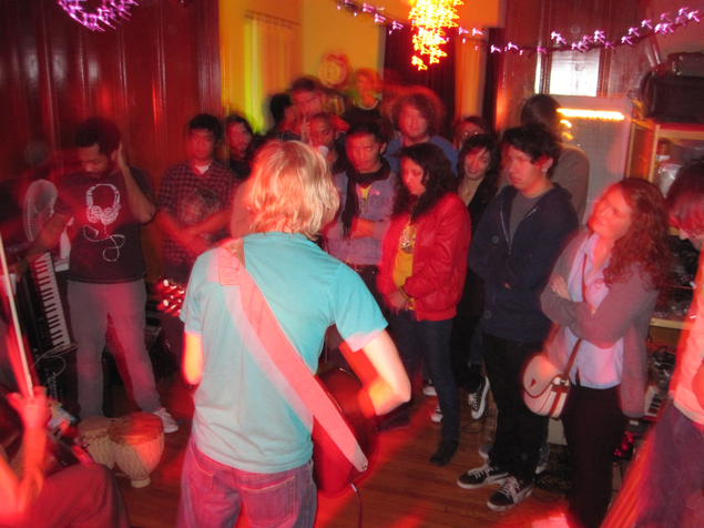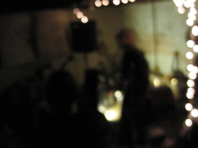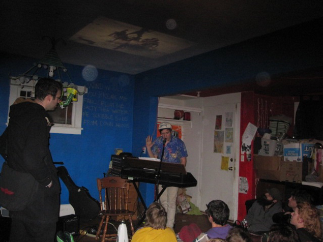 Kelly from Splinter Cake played next and started his set off with a lecture of guitar stylings of the future, at times hanging upside down and batting at his guitar which had a rope tied around it that lead to a log hidden behind a dirty mattress. In the background various noises were played from cassette decks hidden in the rafters as well a Black Flag 7″ being played on a Fischer Price record player at the wrong speed. The set concluded with a handful of songs, yelling and stomping. We played after this strumming and nervously pacing around the basement. Foot Ox concluded the night, playing a solo set and stringing Christmas lights through the audience.
